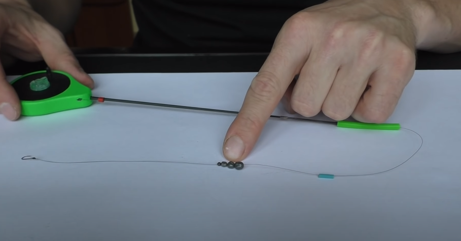 Переходим к снасти - с двумя крюками. Оснастка с двумя крючками делается точно так же до того момента, когда мы набрали балк грузил, так что поплавок практически тонет. Здесь нам нужно учесть массу верхнего крючка, который будет располагаться над подпаском, и чтобы он не ложился на дно.
