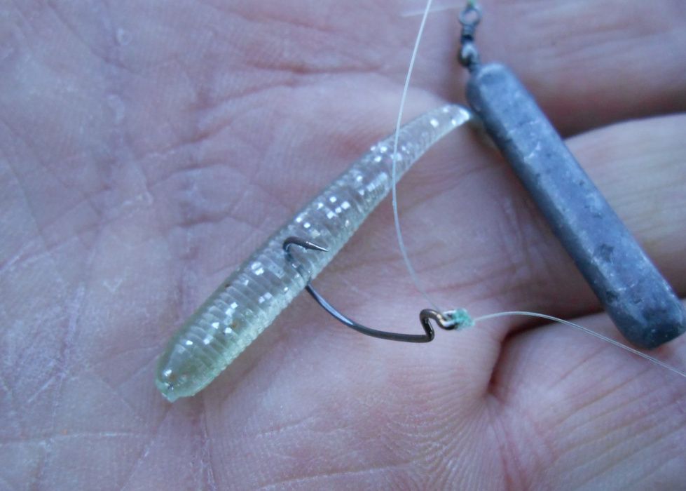 Вот у нас получилась такая оснасточка. В зависимости от дальности заброса будет расположение приманок и сюда мы можем использовать приманки, которые кому какие по душе. Это могут быть твистера. Это может быть виброхвост, который можно надеть как за голову, так и полностью на все тело. А также какие либо ракообразные приманки.