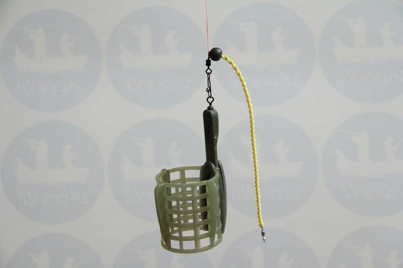 Отвод поводка делаем такой длины, чтобы был ниже кормушки. При вываживании рыбы, за счет того что у нас кормушка свободно ходит по леске, мы будем чувствовать только сопротивления рыбы, потому что кормушка скатится вверх по леске. Снасть готова!
