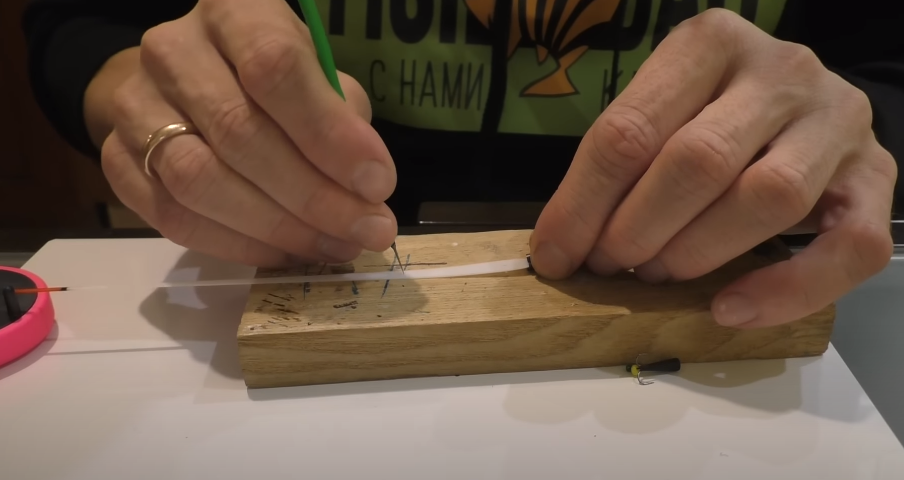 Этот кивок совсем новый и у него есть только одно отверстие. И для того, чтобы во время игры леска не сваливалась с пластины кивка и не появлялась дуга, я всегда делаю третье отверстие в теле кивка, поэтому сейчас просто его пробью. Иглой намечаю, где стоит сделать отверстие и буравчиком расширяю отверстие. Обязательно прохожу сверлом, чтобы леска очень свободно здесь могла проходить. Это прям важно. И вот это отверстие. оно будет позволять леске лежать на самой пластине кивка, никуда не сваливаться. И при этом качество игры всей снасти вырастет.