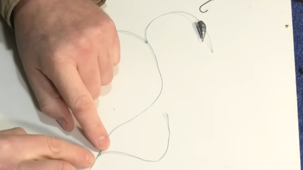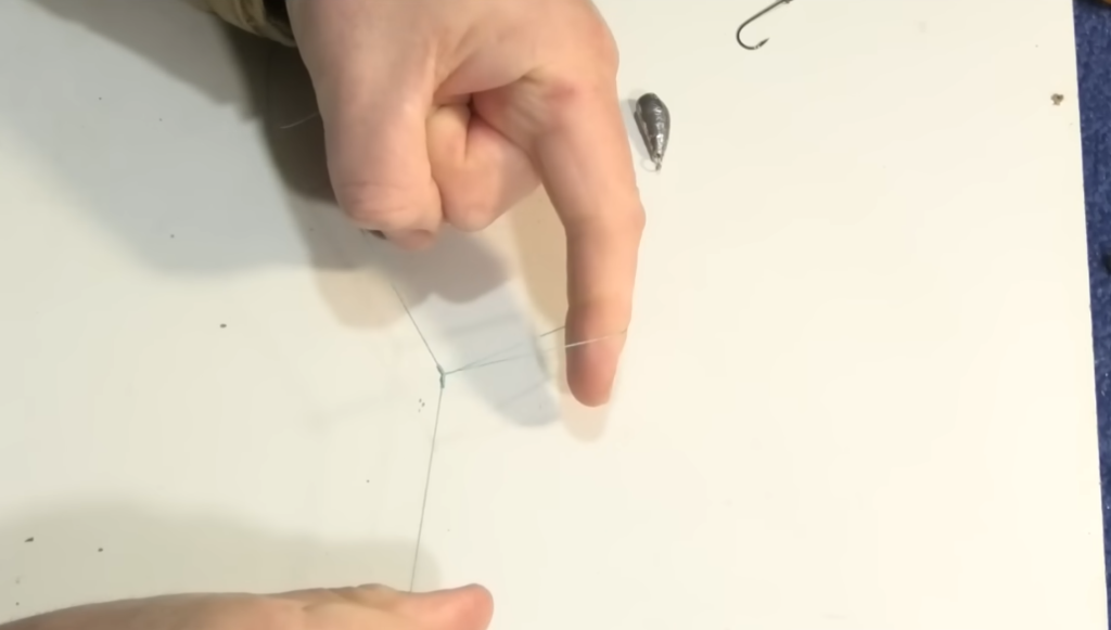 Получаем красивый маленький узелочек. Отступаем от него примерно 20 сантиметров и снова складываем флюорокарбон вдвое. Верхние две ниточки переплетаем, а нижнюю достаём в образовавшееся колечко. Смачиваем и снова затягиваем. На флюорокарбоне это всё получается красивее.