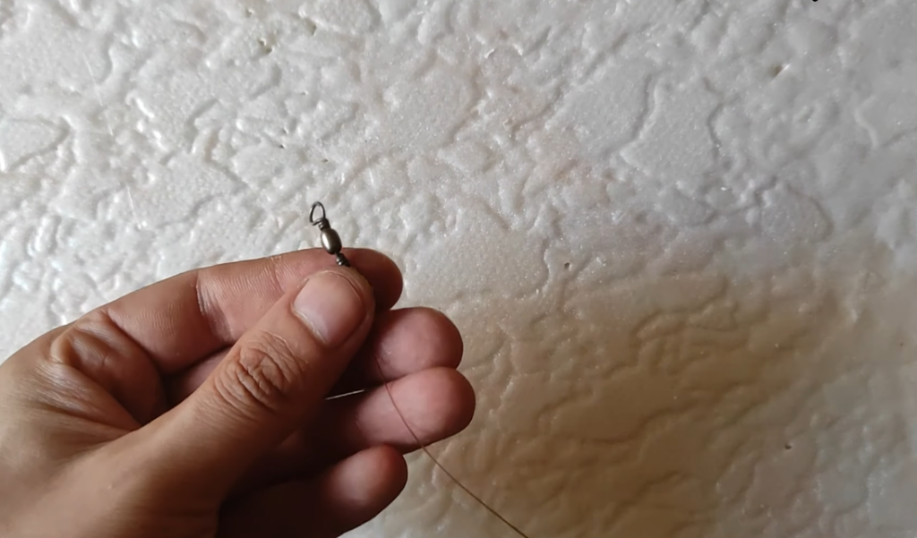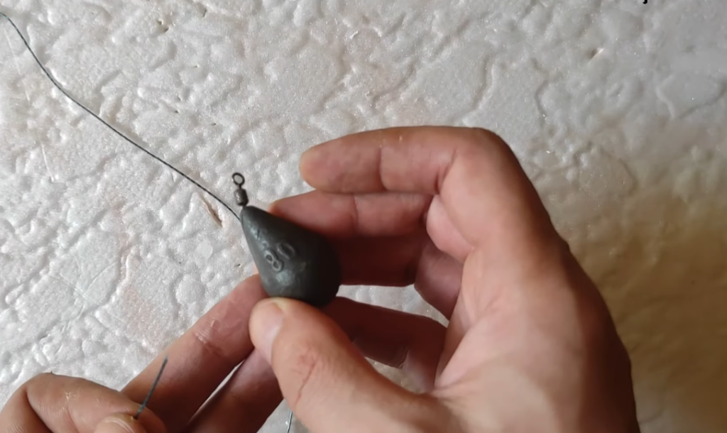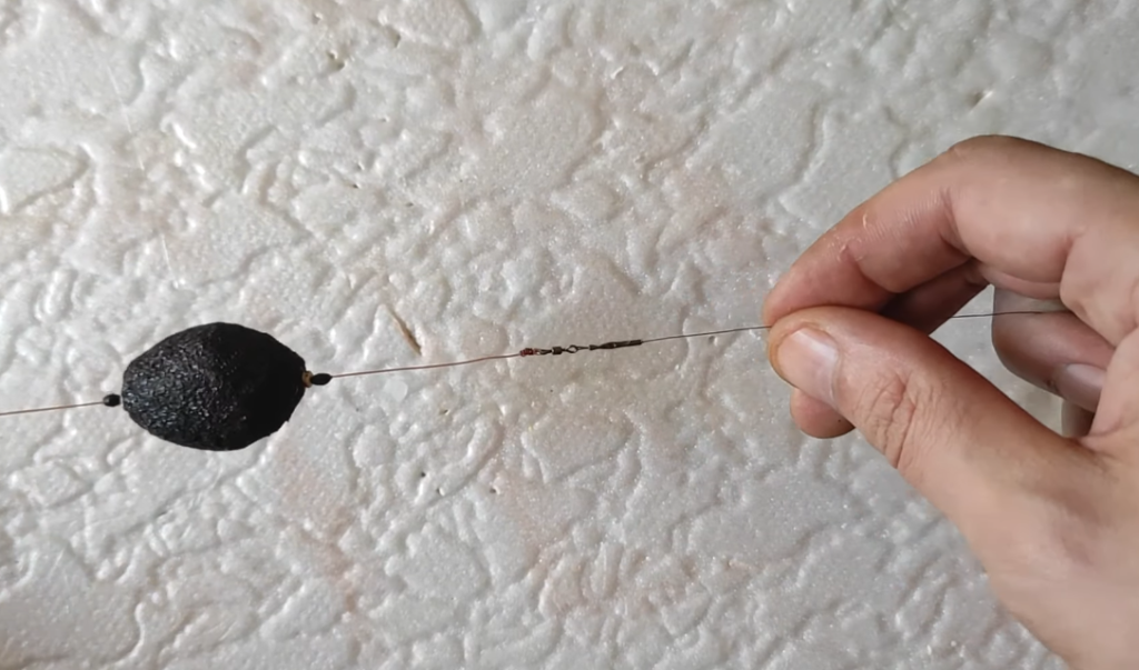 Дальше беру обычную бусину, бисер обычный, и завожу вслед за грузилом. Далее крепим наш получившийся поводок к нашему вертлюжку, также креплю клинчем. Получается груз скользящий чтобы хищник при поклевке его не почувствовал.