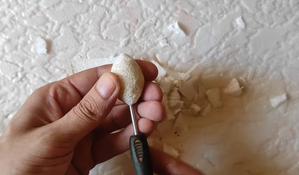 Далее беру отвёртку обычную крестовую и проделываю отверстие посреди нашего поплавочка таким способом.