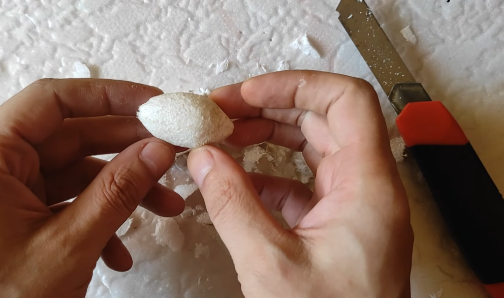 Для этого нам понадобится подводный поплавок, если у вас нет возможности купить его, берём пенополистирол или твёрдый пенопласт и канцелярским ножом обрабатываем таким способом, чтобы получился как бы поплавок у нас вот такой вот формы.