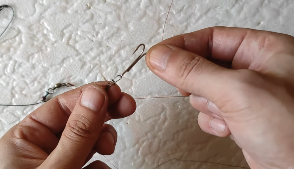 Далее на наш поводок на карабин крепим крючок, кто-то крепит двойник, кто-то одинарный крючок, я возьму тройничок. Тройник заводим в наш карабинчик, на который, собственно, и будем цеплять нашего живца.