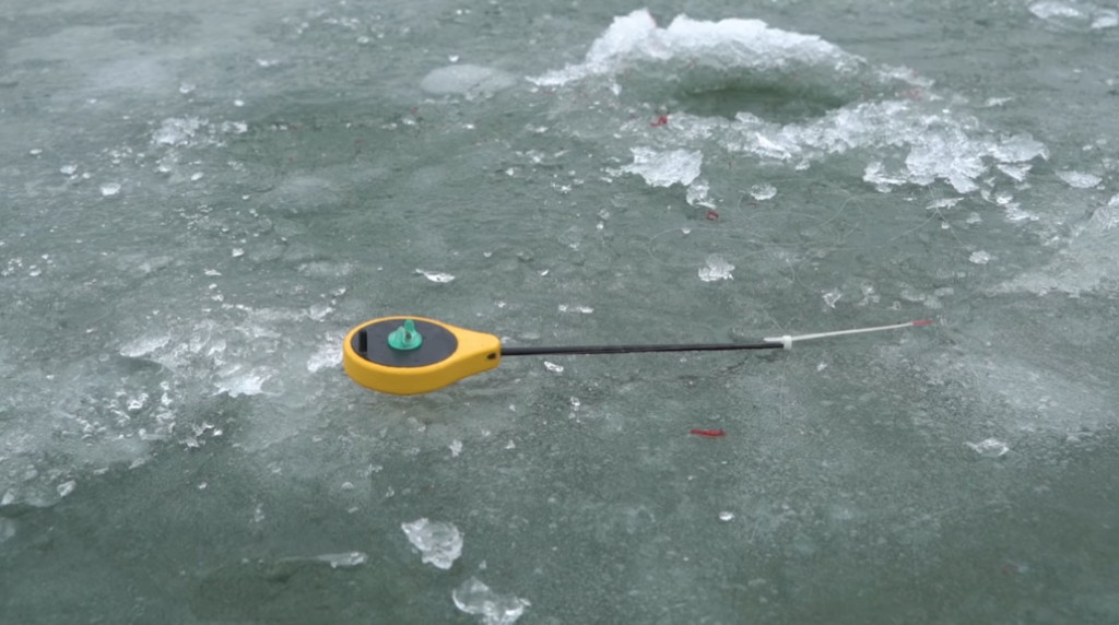Если вы вдруг захотели половить щук, либо бегаем с балансиром, делая много-много лунок, проверяем, если щука активна, и она должна клюнуть довольно быстро, но это уже тактика, либо жерлицы, самая простая жерлица — это рогулька, на которую намотана леска, крючочек, грузик, сейчас в продаже просто масса различных жерлиц готовых, собственно говоря, суть в них у всех примерно одинаковые, ставится тройник или двойник, вяжется поводочек флюорокарбоновый либо же одевается стальной поводок, грузик, одевается живец, опускается в лунку, ставится всё это у нас на лед, флажок, ждем и наблюдаем на льду, что происходит, щука приплыла, схватила, скушала, наш флажочек поднялся, щучка поплыла ням-ням-ням, разматывает, прибежали, подсекли, вытащили.