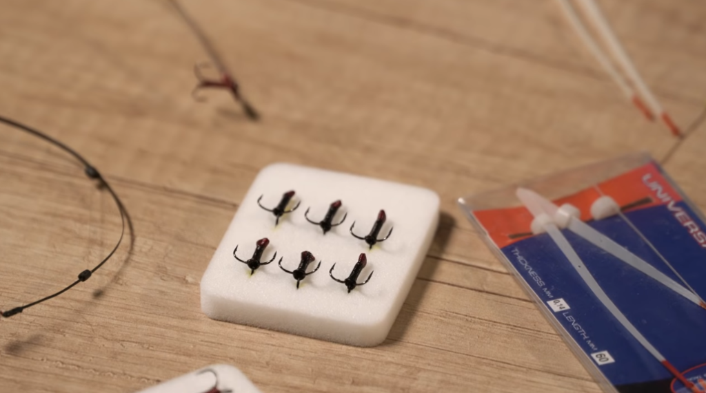 Если ловля на больших глубинах, то здесь используется гирлянда, снасть такая, в которой поочередно идет с интервалом 20, 30, 40, 50 сантиметров ряд мормышек, ну, скажем, 5 у нас разрешено по закону, вот 5 мормышек и ставим, здесь в данном случае стоять чертики, то есть такой тройничок, на который намотана проволочка, то же самое, насадка не одевается, играется просто руками.