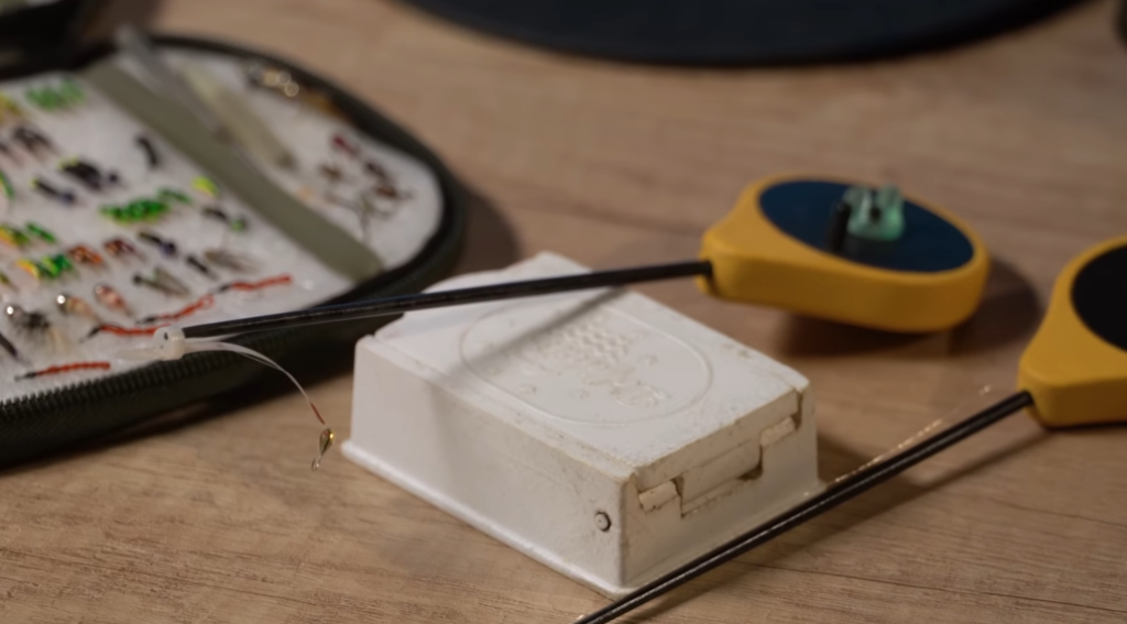 И абсолютно противоположное, наверное, все-таки для ловли окуня, потому что у окуня губа достаточно мягкая, и на очень жесткий хлыстик будет просто рваться. Кивок опять-таки кивки могут быть самые разные, но, поверьте, очень важно при ловле на блесну, такой простой силиконовый кивок позволяет убрать все паразитные колебания, потому что, скажем, на обычных кивках когда после подброса очень часто кивок сам пытается доигрывать еще нашей приманкой, поэтому не смотрите, что выглядит очень убого, на самом деле он как раз в одно колебание гасит все. Очень часто можно ловить вообще без кивка, потому что удар хищной рыбы всегда ощущается через удочку в руку.