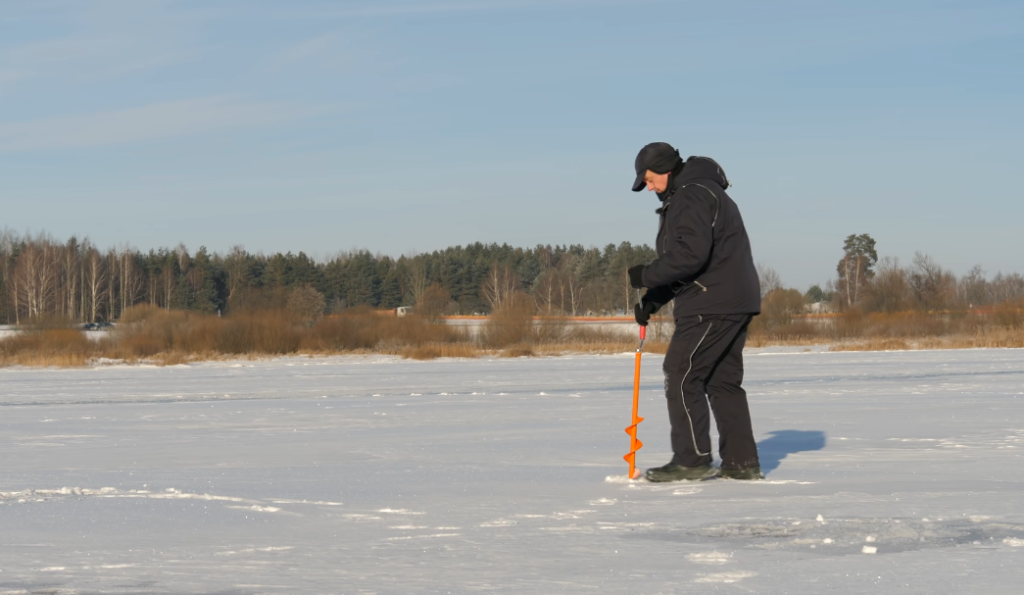 Там, где у меня было большое количество поклевок, я оставил на льду метки, и сейчас, ориентируясь по этим меткам, я просверлю еще лунки в сторону меток, с другой стороны от меток, но и как бы надо будет опять ходить, то есть ориентируясь на поклевки, просверливать, постоянно локализуешь место, где рыбы наибольшее количество.