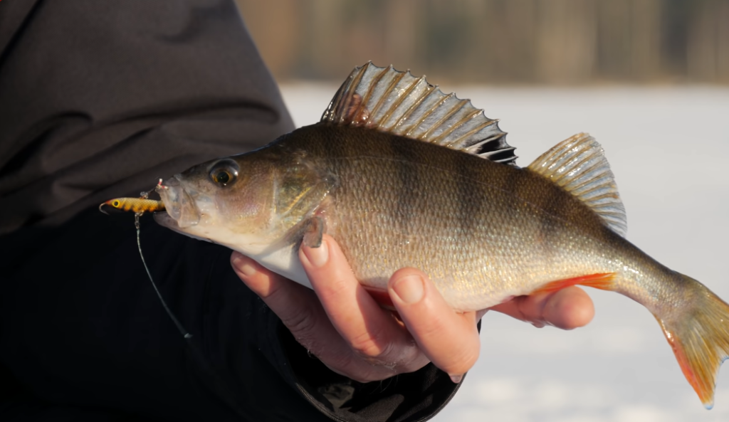 Окунь подогревается под нижнюю челюсть, это говорит о том, что клевать он практически не хочет, наверное, чувствует падение давления, сегодня практически весь день было солнечно, и к вечеру усилился морозик, но давление начало падать, а завтра будет уже снег, будет потепление, и рыба это чувствует.