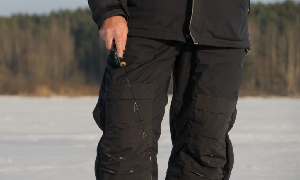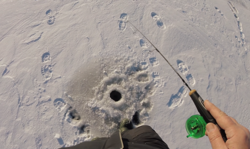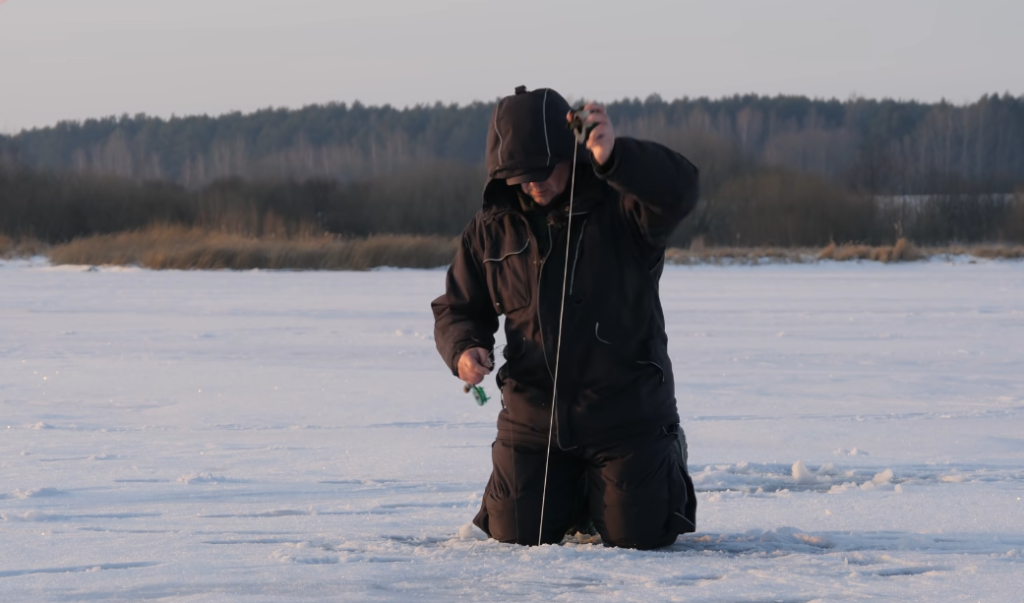 Удочка у меня углепластиковая с леской диаметром 0,18 миллиметров. Более тонкую ставить не хотел, потому что собираюсь ловить на достаточно крупные балансиры и ловить буду таким образом, то есть у меня 5 подбросов 5-6 будут практически без пауз, потом постепенно пауза больше, больше, больше, и где-то 15 махов на 1 лунке.