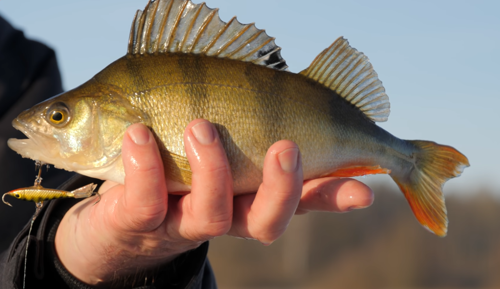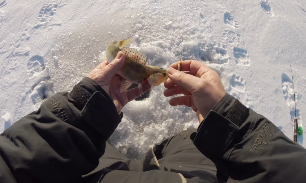 Интересно получается, я начал по горизонтам работать, у меня клюнул сначала маленький окунёк, и только опустил балансир, даже не успел сыграть, и тут же садится этот, то есть активность повысилась у рыбы, надо этим пользоваться, сейчас этого освобожу от крючка и отпущу.