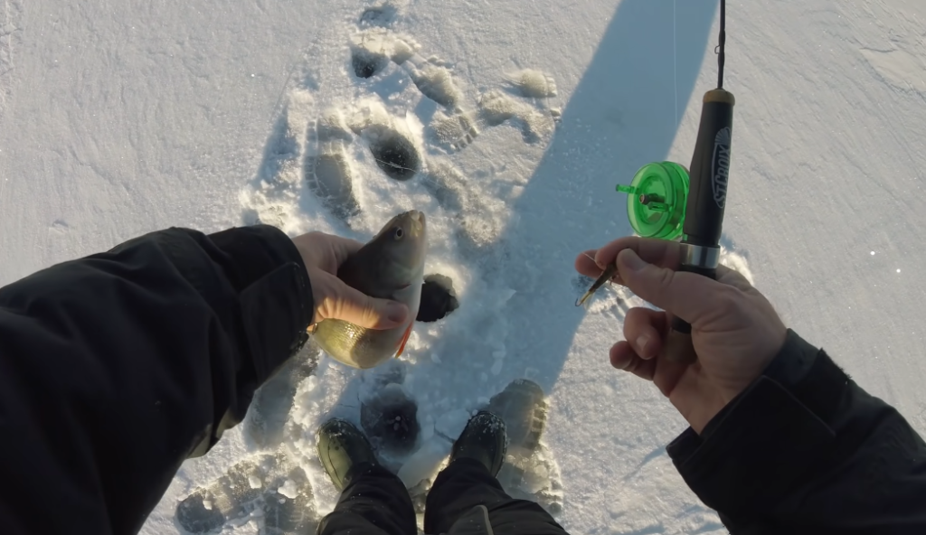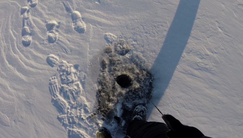 Начинаю ловить уже в новом месте, на русле затопленной речки. Буквальность с первых лунок сразу зацепился за рыбу, наверное, стоит тут ненадолго задержаться.