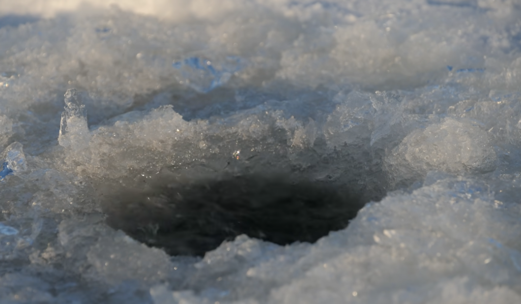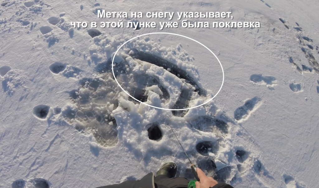 Тут со всех сторон глубина, а поклёвка произошла на бугорке, на вершине бугорка, и это говорит о том, что рыба к вечеру начинает проявлять активность, поэтому нужно двигаться и очень быстро перемещаться, с лунки на лунку.