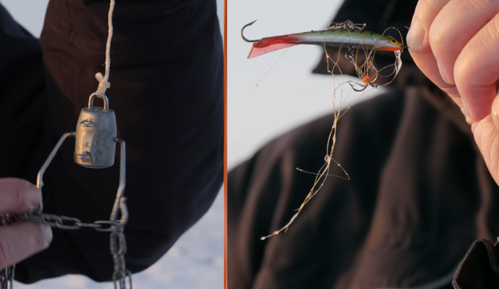 Вторая рыба оказалась покрупнее, уже на входе в лунку один из крючков балансира зацепился за нижнюю кромку льда, у балансиров почти нет недостатков, кроме этого, к слову говоря, при ловле на много крючковые приманки с диаметром лунки лучше не мельчить.