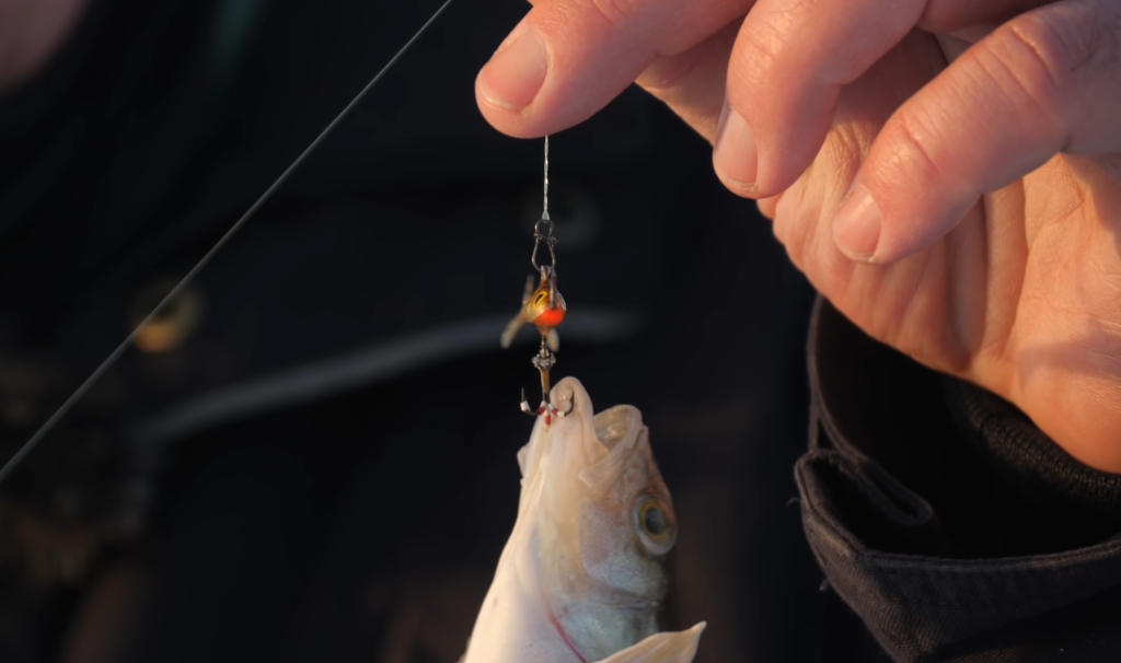 Когда меняешь продолжительность паузы, вероятность поклевок больше, и еще надо будет работать по горизонтам, потому что бывает, что окуни подошли, стоят смотрят, но пока не начинаешь поднимать ступенькой балансир вверх, у них не появляется азарта, то есть они могут не клевать.