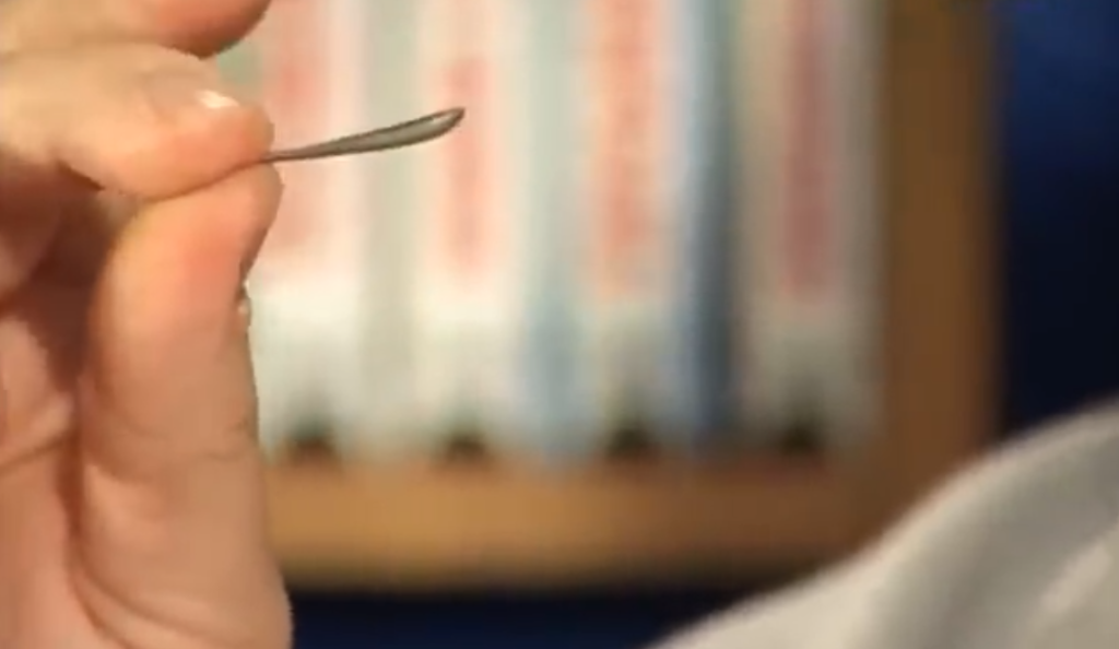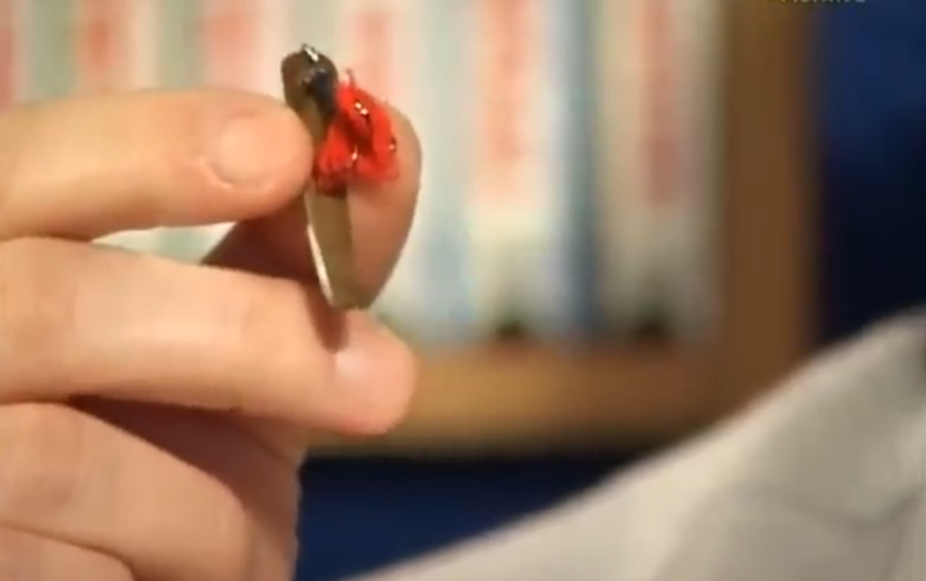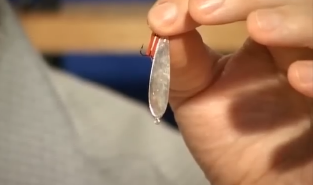 Первичную настройку мы делаем на такой штучке, то есть хлыстик, к нему привязана довольно-таки толстая леска 0,2–0,22 мм, застёжка для быстрой смены — это первичная настройка блесны, и на такой штуке мы настраиваем блёсны, смотрим, на каких взмахах они работают, предварительно подгибаем их, чтобы они не входили в штопор, это первичная настройка.