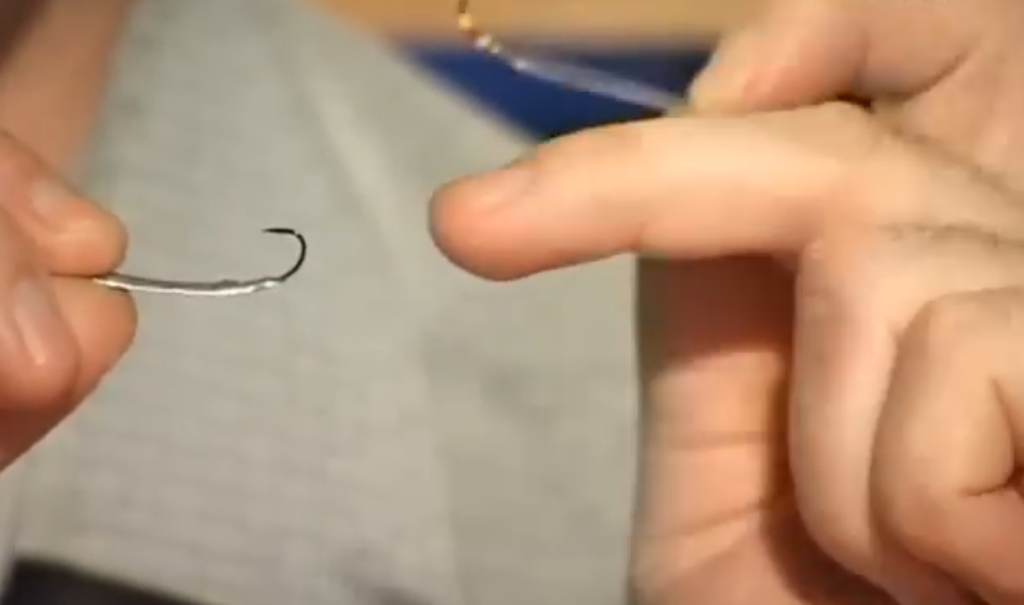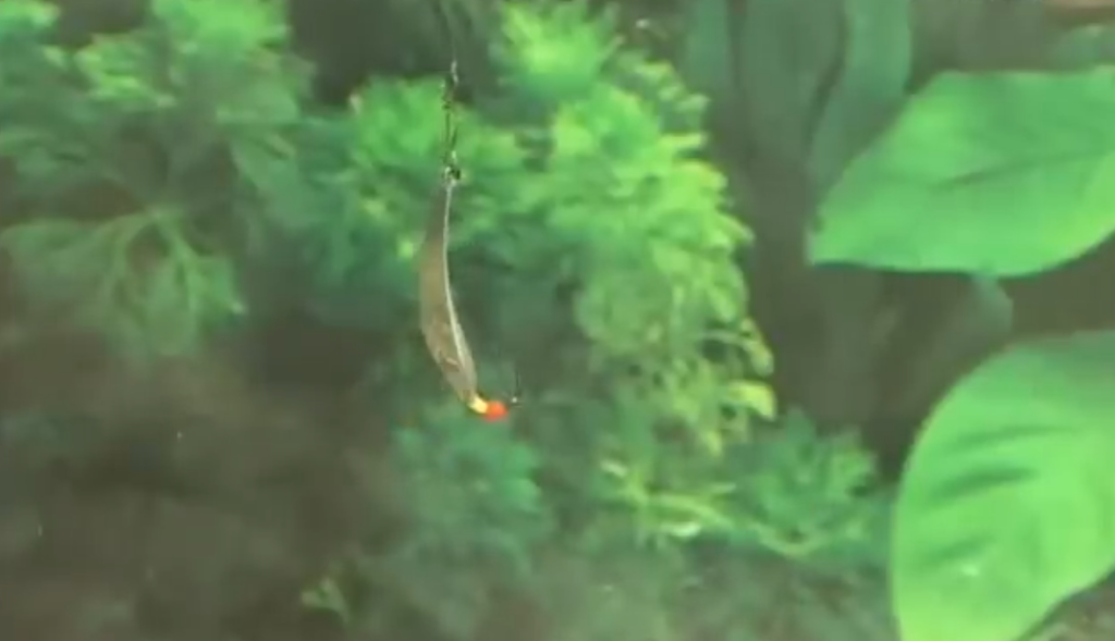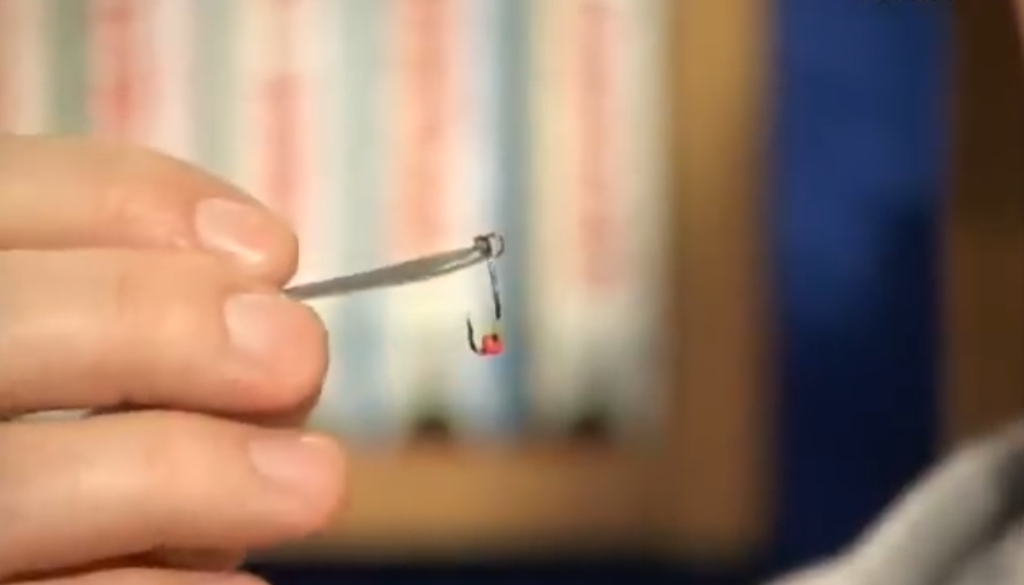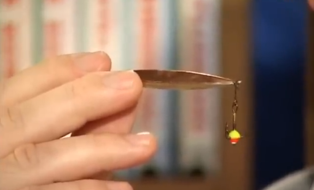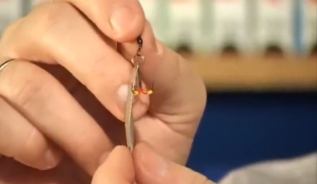 Ещё момент какой, если мы собираемся настраивать блесну и собираемся использовать подвеску, то есть на одной удочке у нас выше блесны на поводке висит крючок с украшениями, второй вариант подвески — свободно подвешенный на леске крючок с бисером, он скользит у нас по леске, причём мы взяли специально крючок нахлыстовый, который имеет загнутое внутрь ушко, и при натянутой леске он у нас скользит вниз рывочками, очень хорошая система.