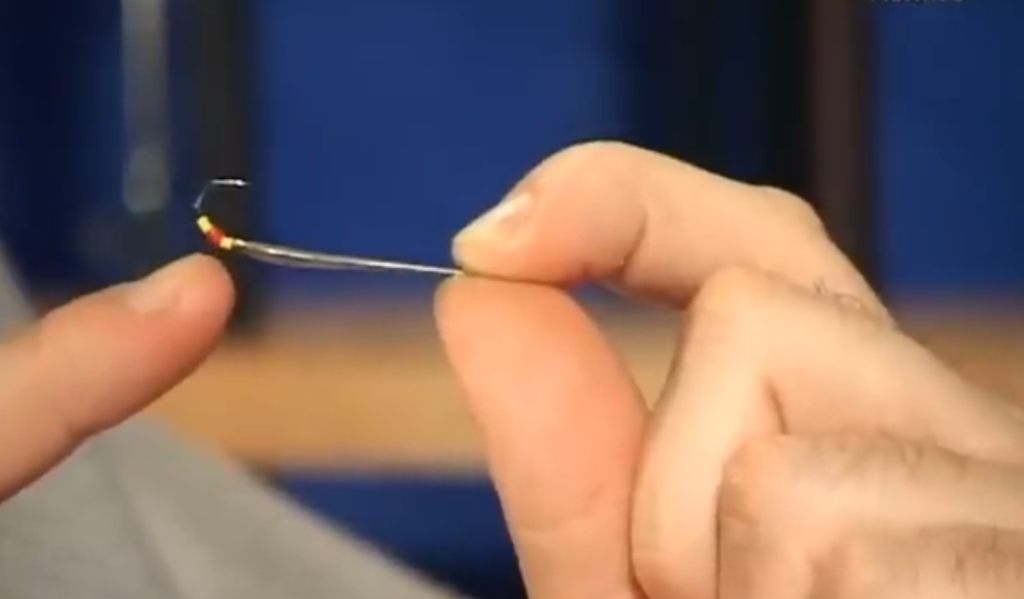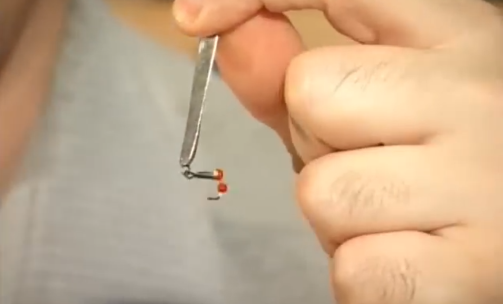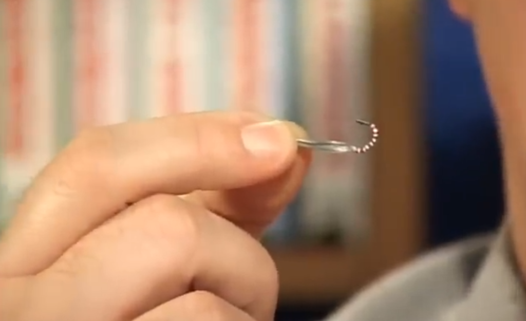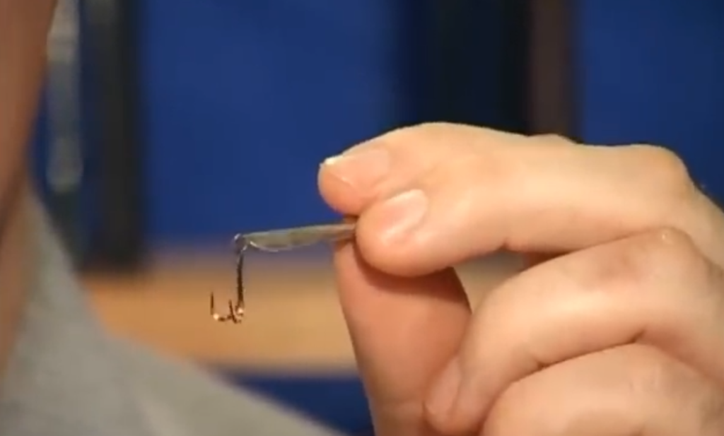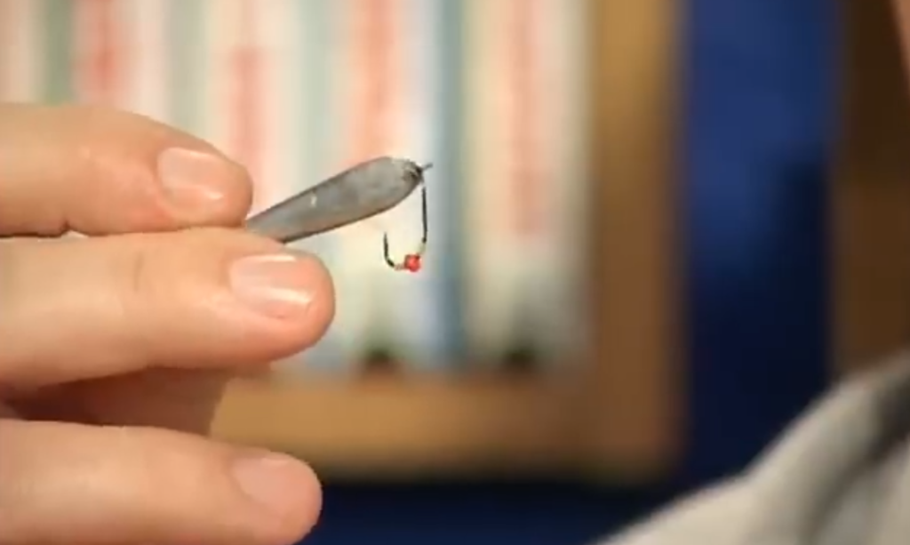 Ещё момент какой, если мы собираемся настраивать блесну и собираемся использовать подвеску, то есть на одной удочке у нас выше блесны на поводке висит крючок с украшениями, второй вариант подвески — свободно подвешенный на леске крючок с бисером, он скользит у нас по леске, причём мы взяли специально крючок нахлыстовый, который имеет загнутое внутрь ушко, и при натянутой леске он у нас скользит вниз рывочками, очень хорошая система.
