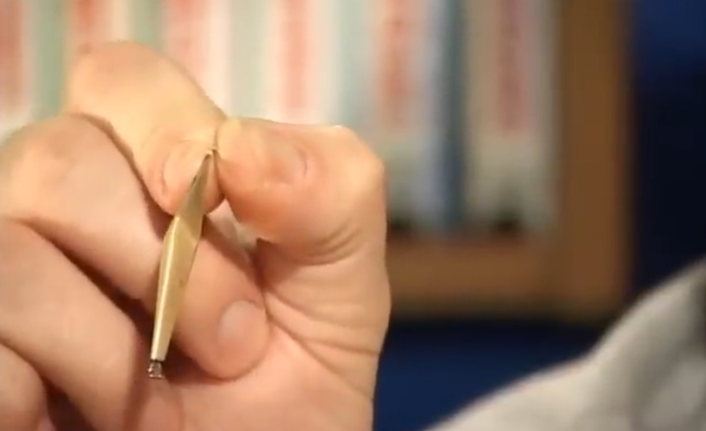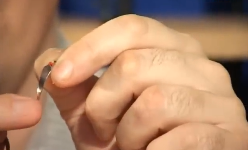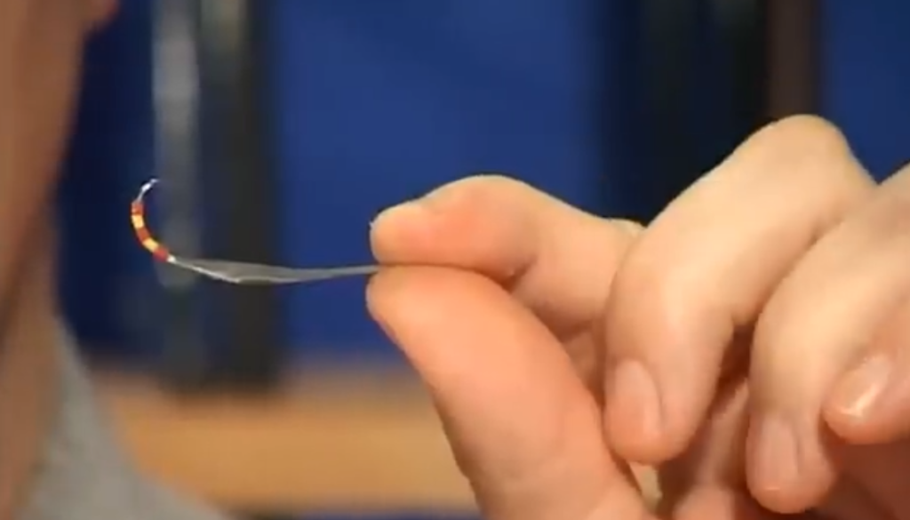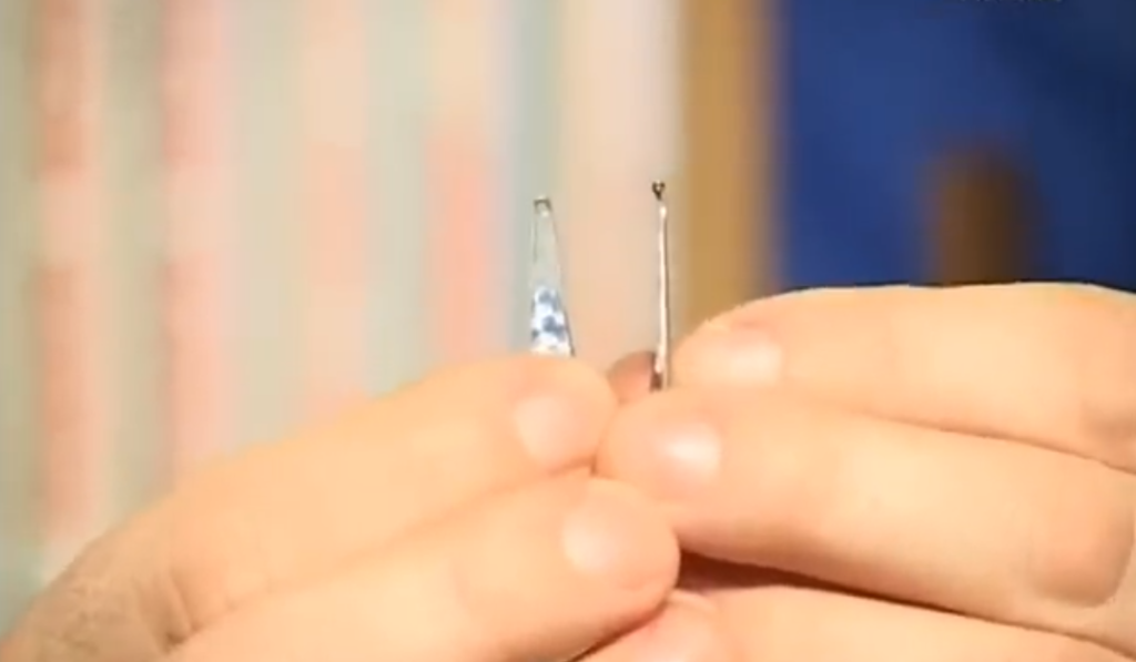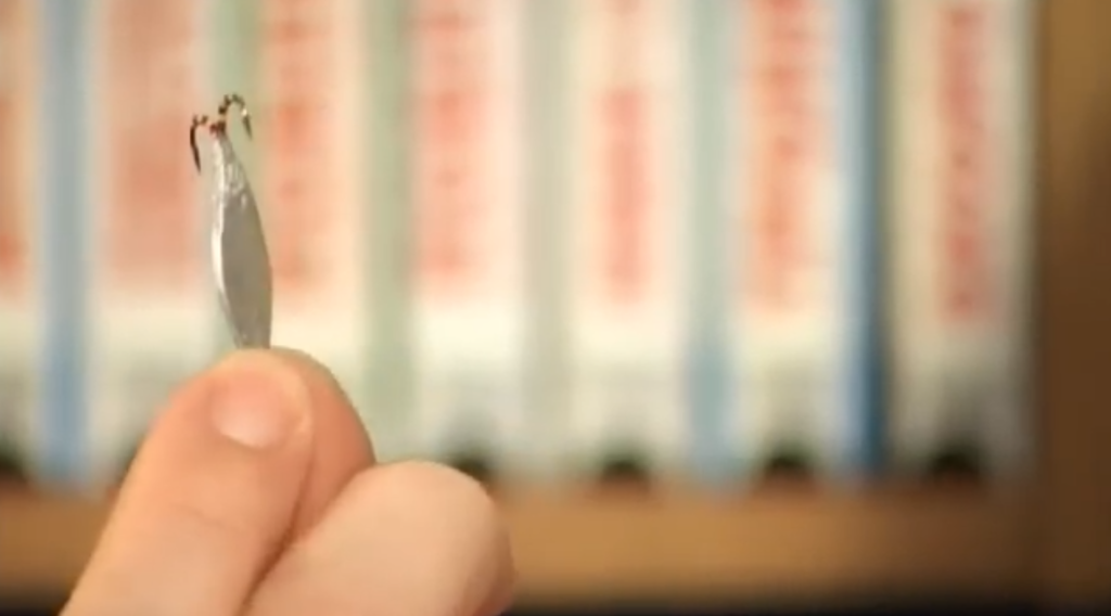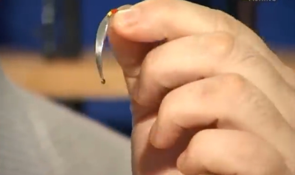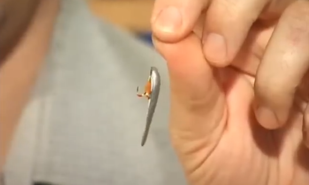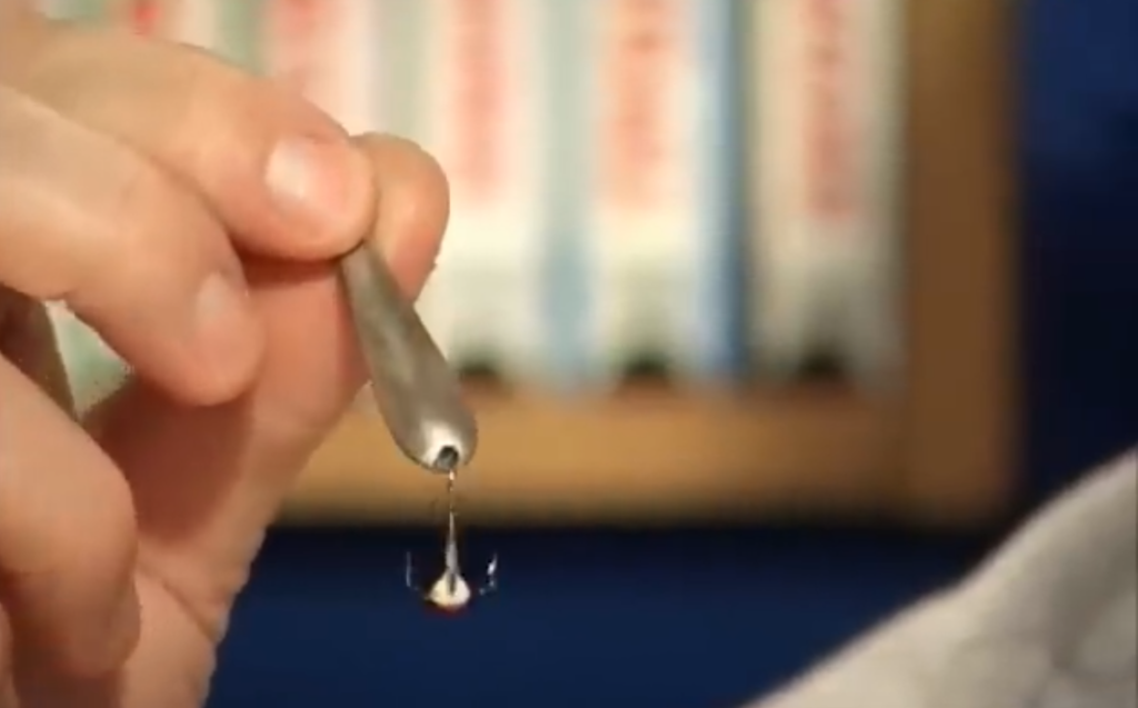 Вторая блесна, тоже видно, что крючок очень глубоко впаян в припой, то есть уже дальше его нельзя засунуть, это правильное положение крючка при пайке.