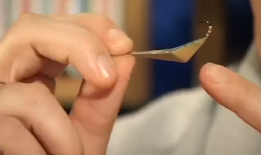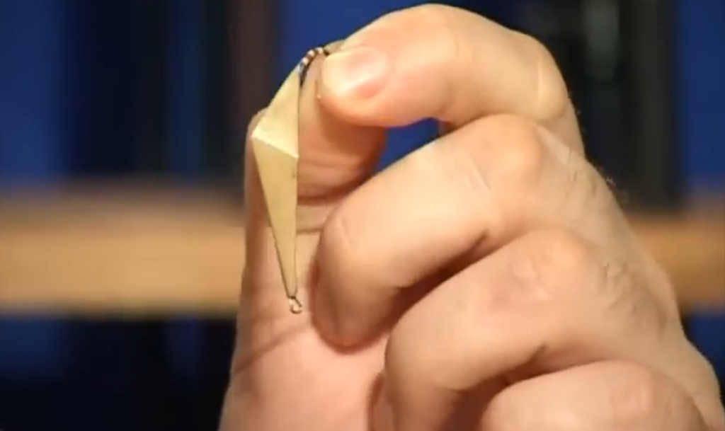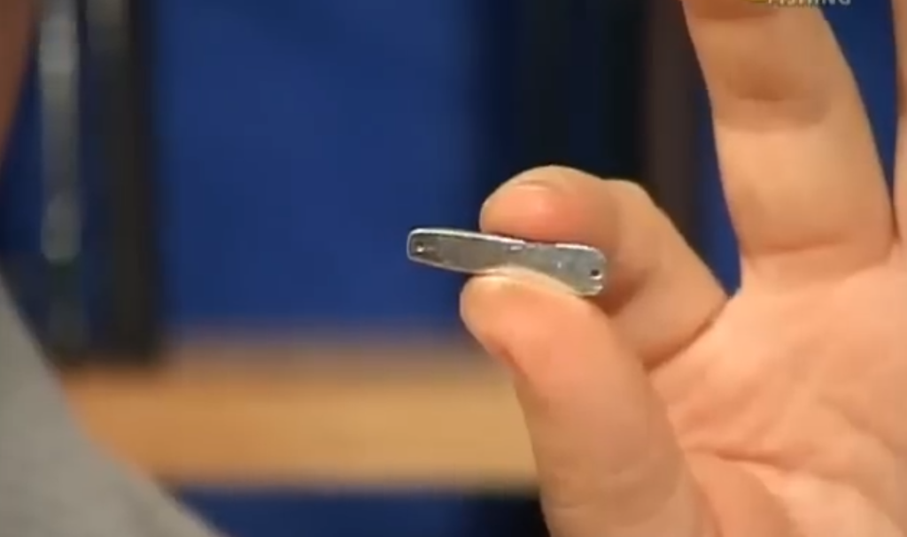 Очень интересным вариантом ещё блёсен является блёсны, у которых задний центр тяжести. Вариантом такой блесны со смещением центра тяжести назад является данная блесна, то есть видно, что эта блесна имеет центр тяжести, расположенный в верхней части, на лесочной петле у нас расположен крючочек и смысл такой блесны, то есть мы поднимаем блесну, отпускаем, она начинает планировать вниз узкой лёгкой частью, потом тяжёлая часть перевешивает, и блесна уже начинает планировать толстой тяжёлой частью вперёд.