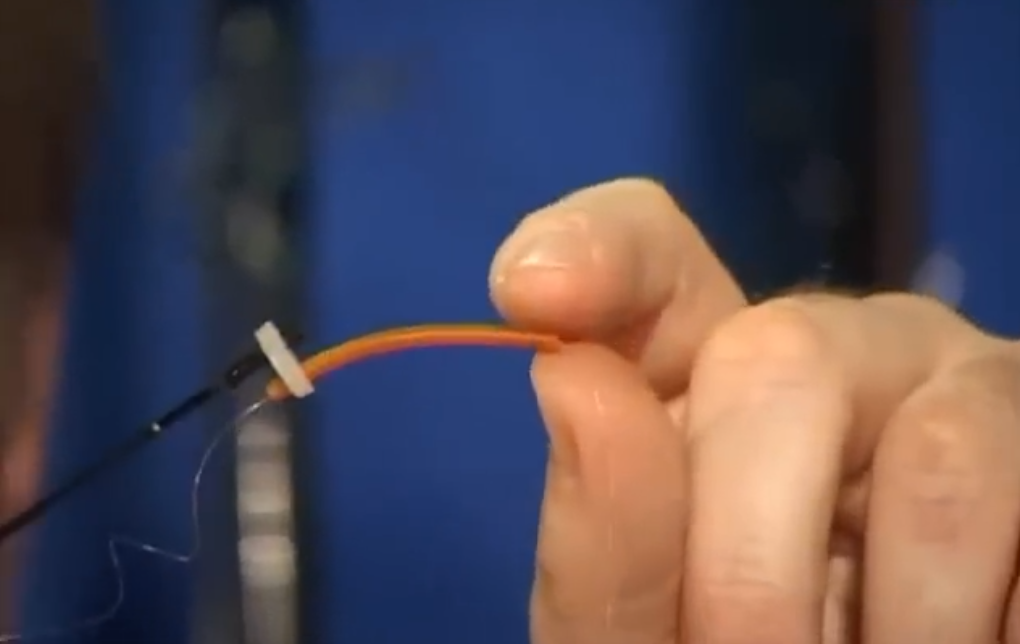 Какой может быть выход из положения, если у нас блесна хорошая, хорошо работает, но у неё просто просверлено отверстие? Чтобы мы себя немножко обезопасили в этом случае, можно взять здесь ниточку и виточек к витку сверху промотать ниточкой, а потом капнуть суперклея, это первый вариант, второй вариант — мы вот в это отверстие вставляем кусочек кембрика изоляции из, из мы достали предварительно сердцевину провода, и тоже капельку клея, чтобы он держался, это второй вариант. Ну и третий вариант, когда мы крепим леску, конечно, мы привязываем не одинарную леску, а сдвоенную леску, это тоже дополнительный плюс и дополнительная подстраховка.