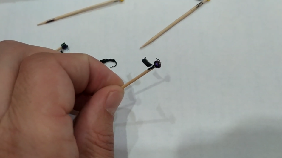 Затем «лесотки», разнообразные «лесотки». Обычно я их обозначаю двумя кембриками: жёлтым и красным. Очень хорошо собирает плотву, но и окунь, естественно, тоже не проходит мимо.