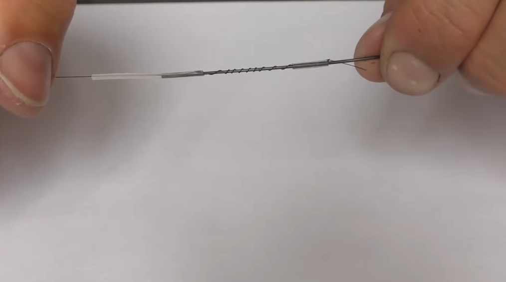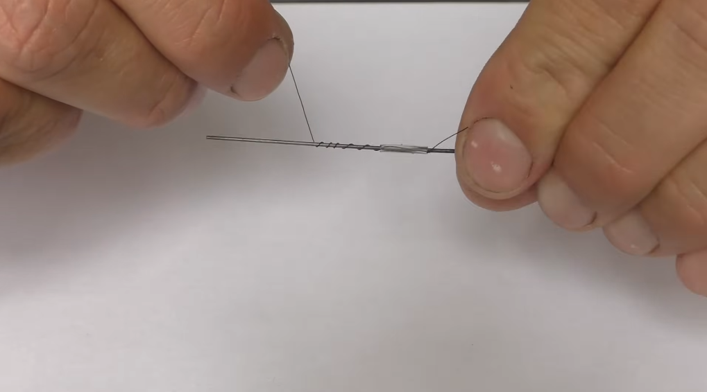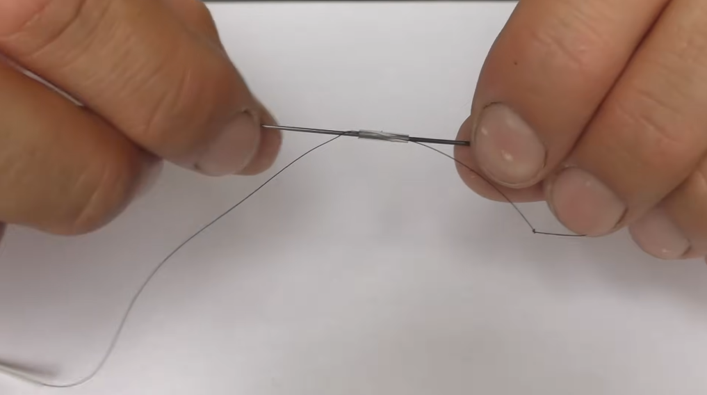 Сначала на леску надеваю длинный кембрик, пропускаю его через всю длину и оставляю на леске, дальше надеваю второй кембрик, теперь на конце лески можно, но не обязательно, но я обычно это делаю, я завязал узелок, просто обычный узелок, ничего сверхъестественного.