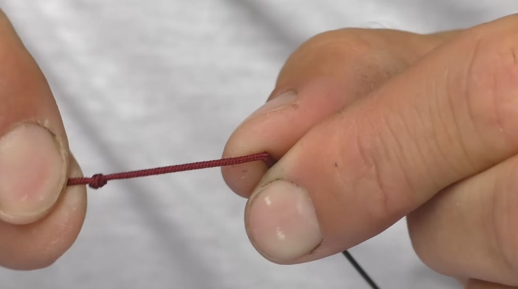 Сейчас я вам покажу, что с этим нужно сделать, первое, с чего начинаем, вяжем обычный узелок из этого шнурка, весь смысл, чтобы получилась на этом шнурке такая бобышка, ну и здесь, чтобы было свободное место для лески, именно здесь методом удавки будет крепиться сама основная леска от вашей оснастки.