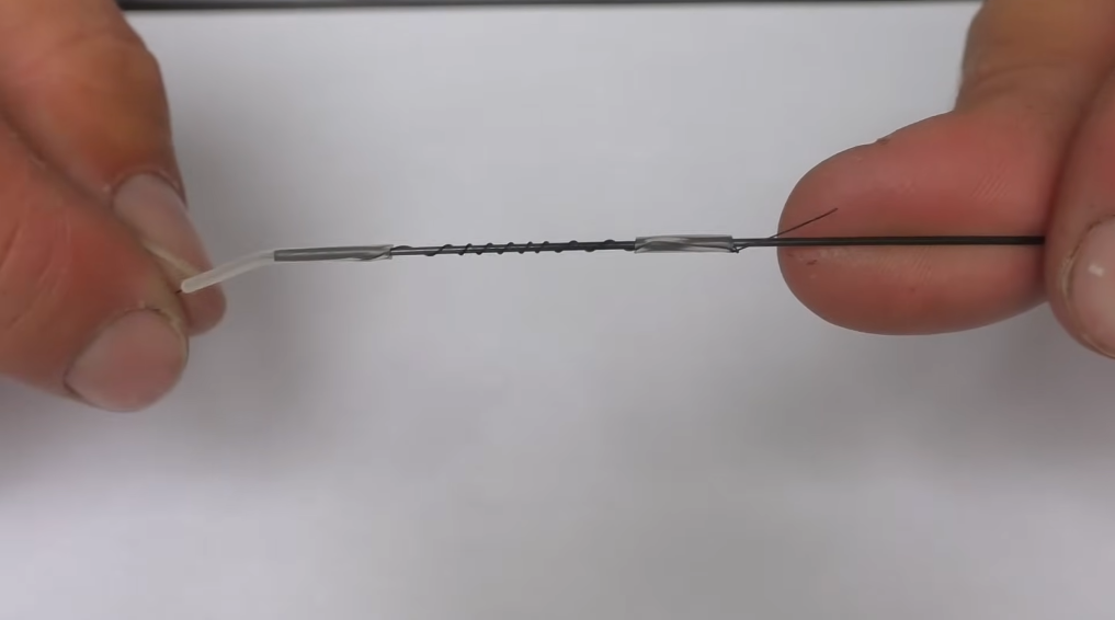 Дальше надеваю длинный кембрик, его я также засовываю на хлыстик удочки примерно на половину или на треть длины, тут уже не сильно важно, но важно, чтобы кембрики были не хлипкие, друзья, потому что, если вы собираетесь ловить толстых рыб, прочность кембрика будет иметь значение.