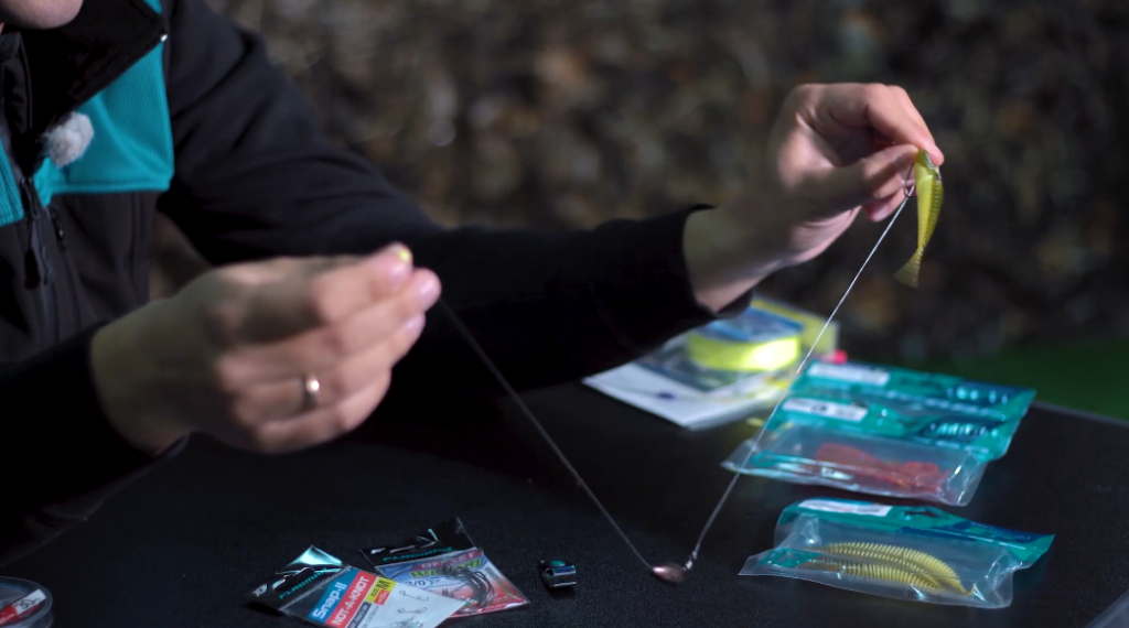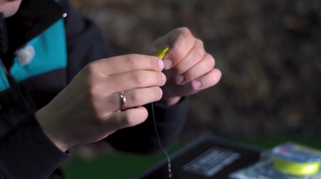 Осталась для наглядности одеть приманку, в данном случае это будет такой мясистый slug крупный, и, как вы видите, буквально за несколько минут оснастка «Каролина» готова к использованию.