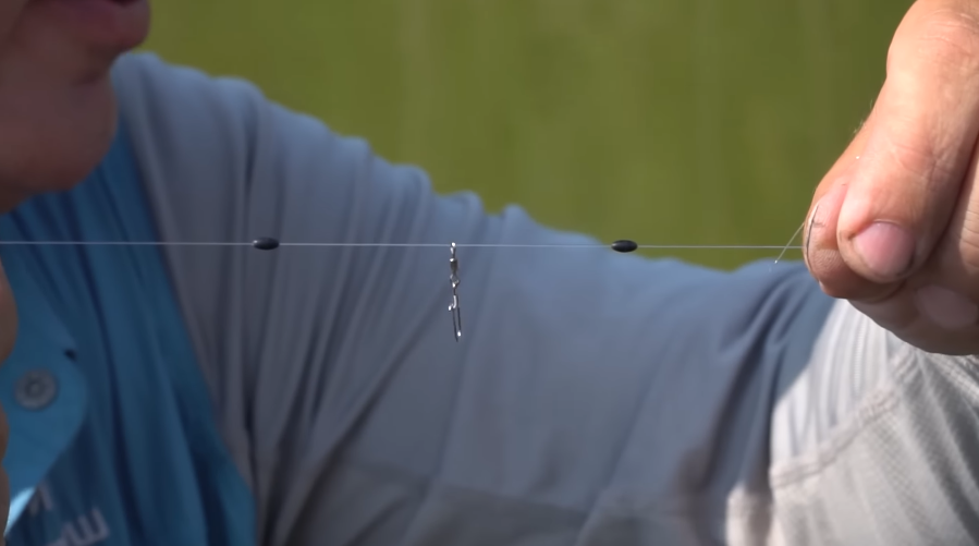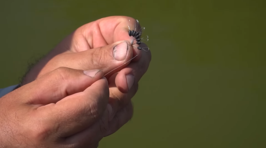 После стопорка — это важный момент, это не все используют — я надеваю вертлюжок с застежкой. Итак у нас есть стопорок, есть вертлюжок, который прекрасно двигается по леске, сверху я закрепляю еще одним стопорком. Вот у нас получается вертлюжок с застежкой между двумя 100-парками. Верхний стопорок обеспечивает глубину, по которой выставляется поплавок, а нижней обеспечивает то, чтобы поплавок не опускался ниже определенного уровня.
