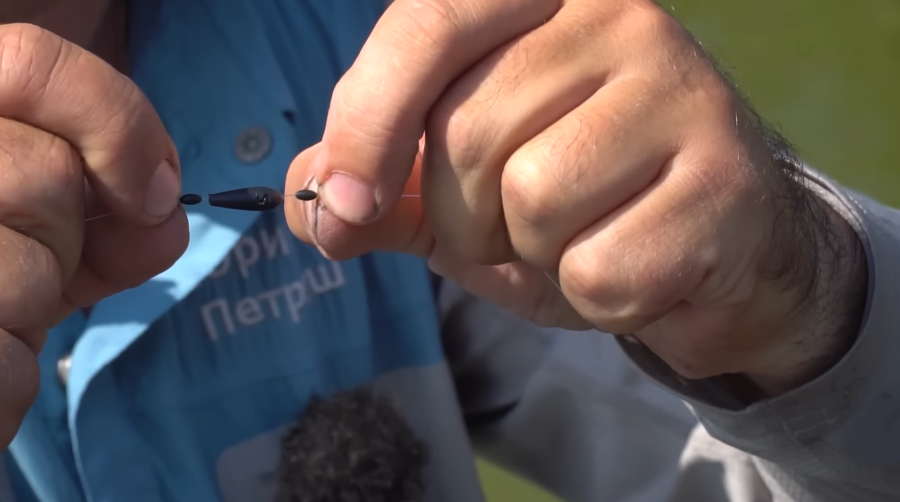 После двух стопорков для поплавка я надеваю еще один. Этот стопорок у меня уже исключительно для фиксации свинца. Затем, не повреждая леску, я надеваю грузик два с половиной грамма, на каждом грузике есть маркировка, это такая оливка, капля, покрашенная в черный цвет, грузик также скользящий. И сверху грузик тоже стопорим еще одним стопорком. Таким образом у нас грузик как бы жестко закреплен, при этом не травмируется леска, и мы можем при необходимости грузик поднимать выше и ниже.