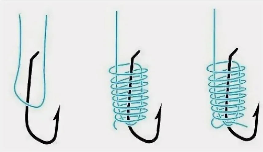 Берем крючок 8 номера, и привязываем крючок. Крючок привязывать со следующим образом: складываем леску вдвое и образовавшуюся петлю прикладываем к крючку, потом берем свободный конец и обматываем вокруг крючка и второй части лески, делаем таких где-то 5–7 оборотов. Сделав 5–7 оборотов, продеваем леску в образовавшуюся петлю и спокойно затягиваем.