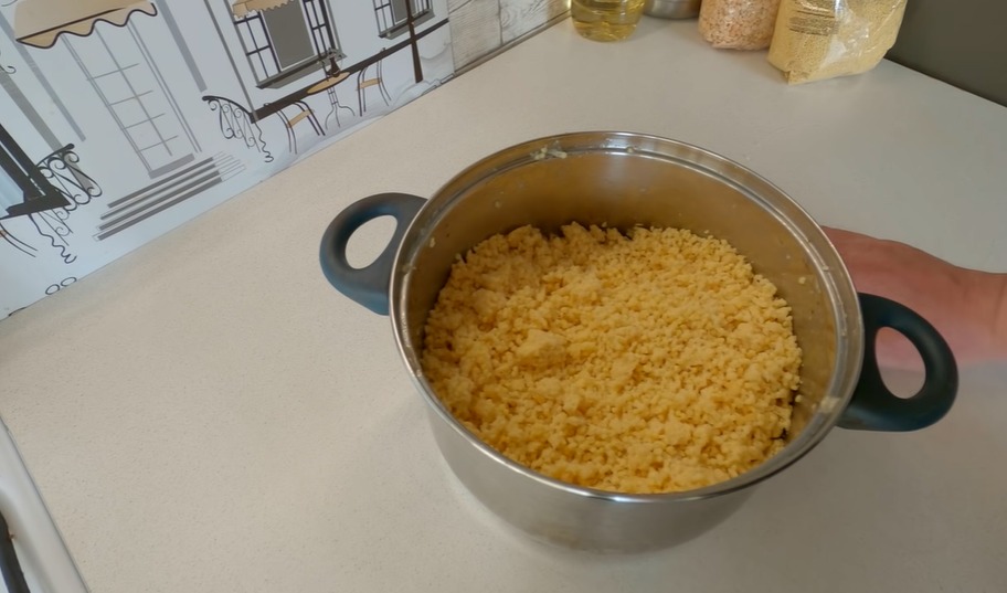 Все пшено с горохом перемешано, теперь убираем его и оставляем остывать. Так, ребята, прикормка у нас полностью остыла. Давайте посмотрим, что получилось. Смотрите, насколько она рассыпчатая, не слипшиеся. Но при всем этом, если мы её сожмём, то она вполне лепится и рассыпается по классике жанра.