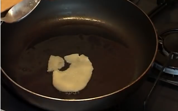 Значит, степень прогрева определяем по тому моменту, что манка начинает из молочно-белой становится прозрачной. И вот мы видим, что нижняя сторона прожарилась, мы аккуратненько переворачиваем на другую сторону, опять прожарилась, и у нас блинчик должен быть практически прозрачный. Откладываем его в сторонку. Следующую порцию манки делаем и так 2 - 4 блинчика.
