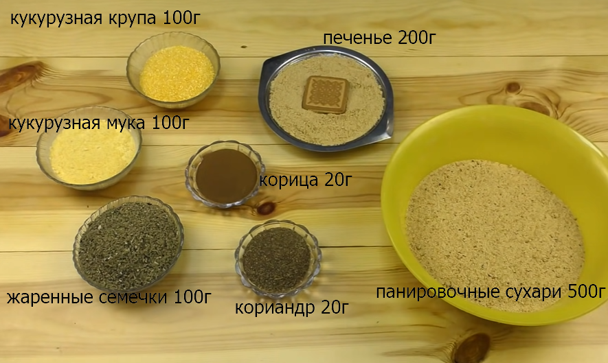 Я все компоненты уже заранее подготовил и сейчас просто расскажу их количество и как именно я их подготавливал. Значит, для приготовления одного килограмма сухой прикормки нам понадобится 500 грамм панировочных сухарей.