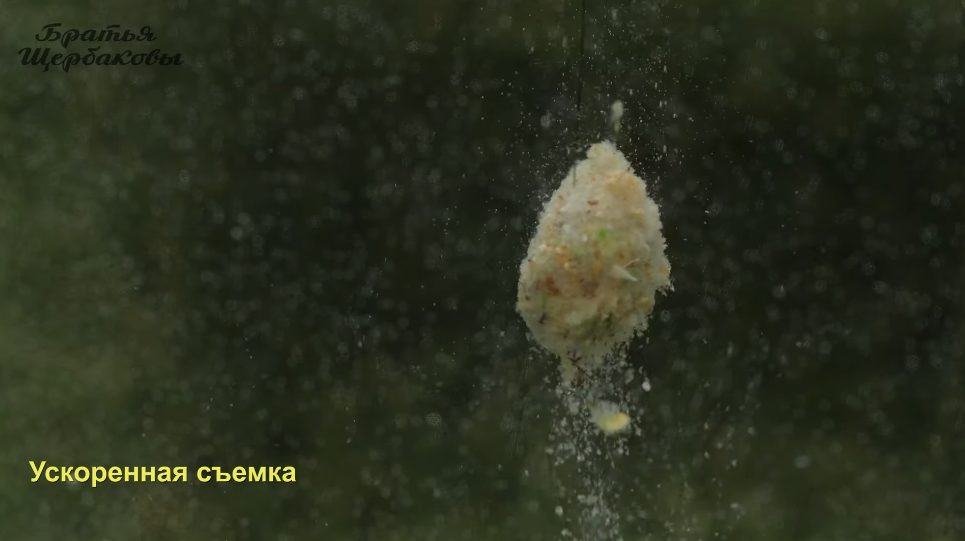 Формируем на крючке колобок и опускаем в воду. Время пошло. Колобок теста начинает интенсивно пылить и постепенно сыпаться.