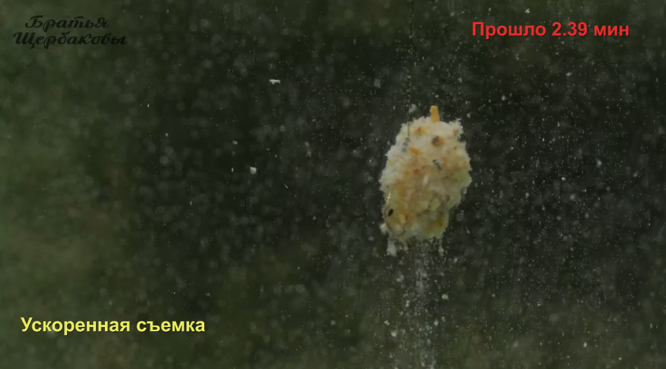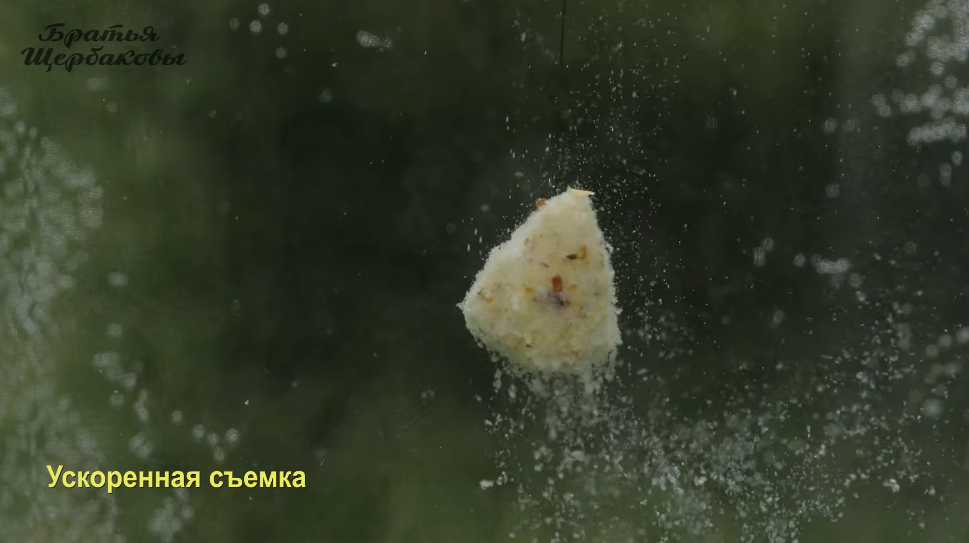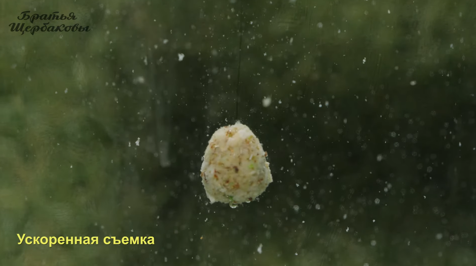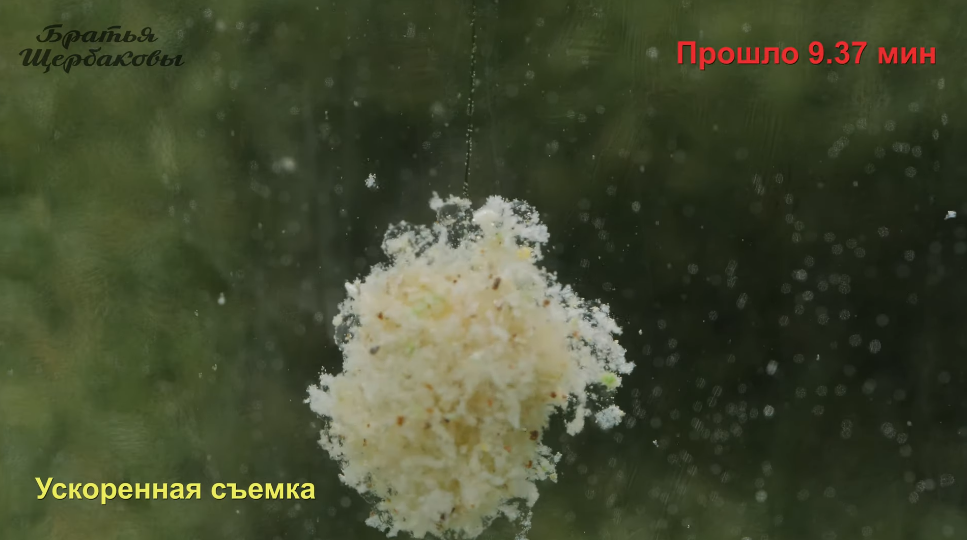 Формируем на крючке колобок и опускаем в воду. Время пошло. Колобок теста начинает интенсивно пылить и постепенно сыпаться.