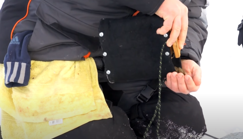 Ещё хочу сказать, что является очень важной особенностью, что сама кормушка является глубиномером. У меня метры отмерены узелками, и когда я опускаю кормушку, сразу считаю, сколько метров в этом месте глубина. И, переходя от лунки к лунке, я, естественно, уже ориентируюсь по глубине, по рельефу и кормлю наиболее перспективные участки. Либо, допустим, просверлил 5 лунок, тут же их закармливаю. Обнаружив, что выхожу на не интересующий мне участок, могу вернуться обратно и пойти в другом направлении, то есть сверлить в другую сторону.