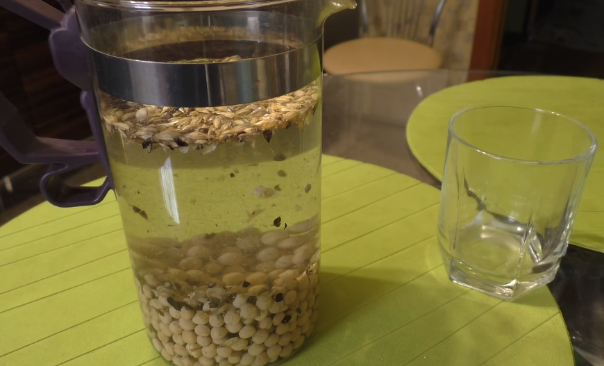 Для этого нам понадобится стакан гороха. Емкость в один литр, пересыпаем в неё горох. Заливаем всё водой.