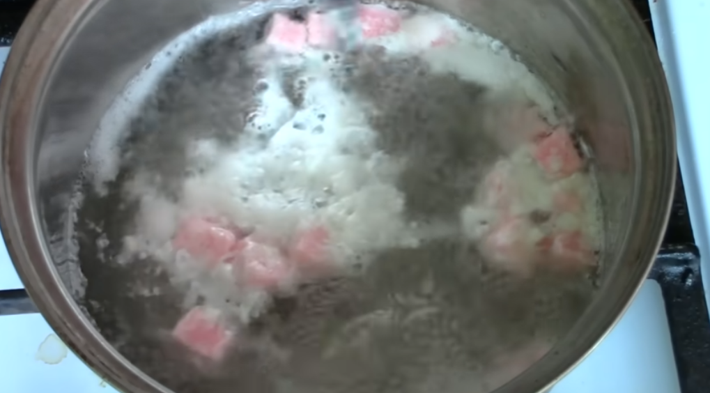 Дальше берем кастрюльку или ковшик, ставим на огонь и ждем, пока закипит вода. Водичка у нас закипела, поролон наш пропитался, и вот так аккуратненько по одной штучке, чтобы не склеивались, опускаем кубики в кипяток, вымешиваем, пока белок не сварится внутри губки.