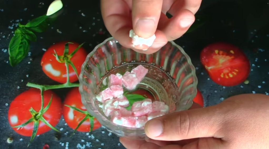 Нарезаем на такие кубики и быстро отправляем, так сказать, в нашу белковую смесь и хорошенько их пропитываем, лучше всего это делать ложечкой маленькой, через бока продавливаем, хорошо пропитываем.