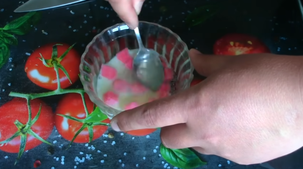 Итак, у нас получился белок, берем две чайных ложки молока либо одну столовую, добавляем в емкость с белком, это для того, чтобы немного разжижить белок.