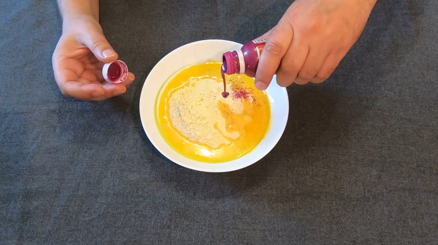 И начинаем процесс замешивания, выливаем готовое яичко в муку и для красоты добавляю краситель, в данном случае будет фиолетовый.