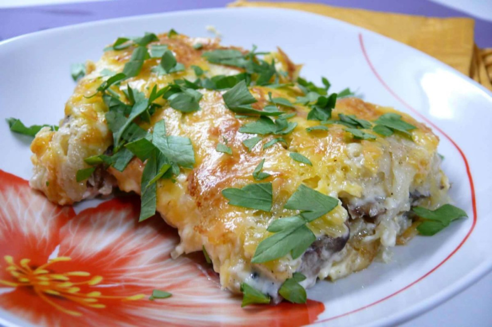 Готовую запеканку опрокинуть на тарелку, нарезать порционными кусками. Отдельно можно подать фруктовый соус или майонез и свежие овощи.