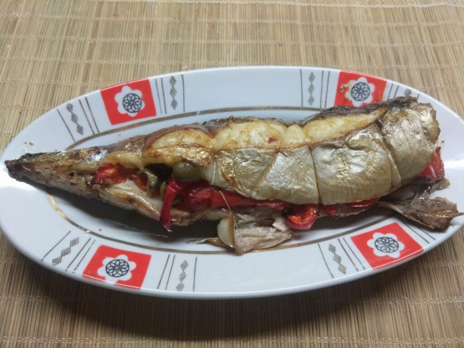Болгарский перец помыть, разрезать полам и удалить семена и перегородки. Половину нарезать соломкой. Выложить на скумбрию, слегка присоленную и приправленную (по вкусу).