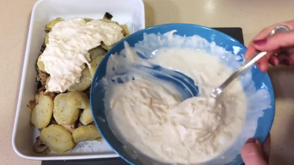 Теперь сделаем сырную заправку. Разбиваем яйцо. На одно яйцо 200 гр.сметаны. Хорошенько взбиваем, сюда же высыпаем тертый сыр и хорошо перемешиваем,