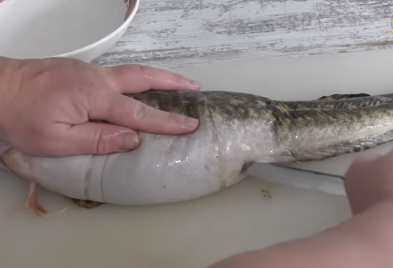Давайте возьмем налима. И перво-наперво, что нужно сделать, это очистить его от слизи. Просто берём нож и все это дело соскабливаем. От слизи очистили. Рыбку еще раз помыли.
