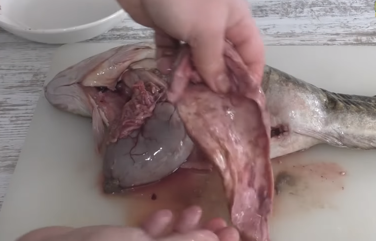 Теперь вскрываем пациента, вынимаем потроха и достаем печень. Налим - рыбка довольно таки постная, но запас жира у него весь хранится в печени. Поэтому печень считается деликатесом. Ее обязательно нужно готовить вместе с ним. Очень жирная, очень питательная и очень вкусная. Называют ее "Макса".